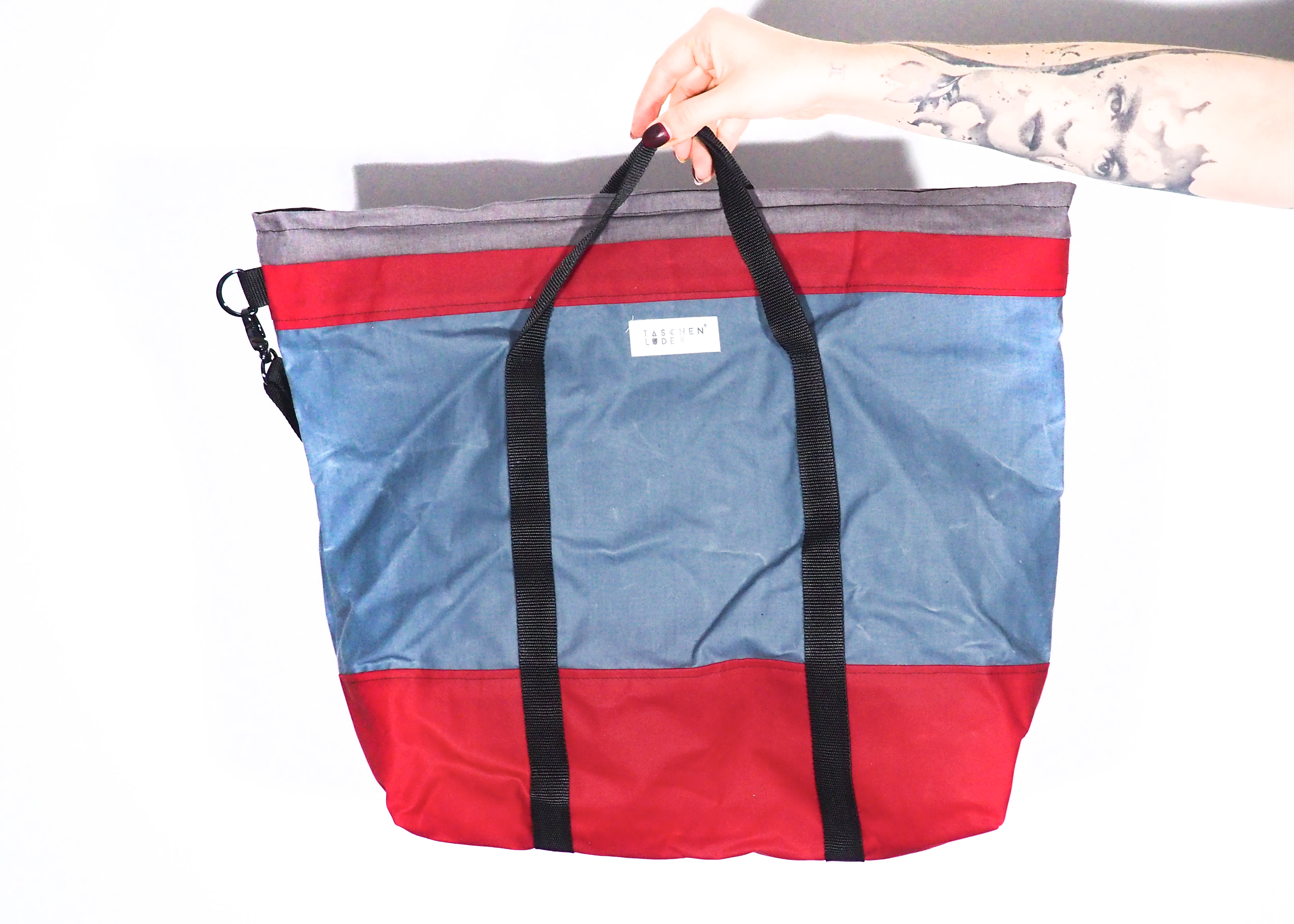 Das Cappuccinoluder red’n’blue ist riesig und hat unglaublich viel Platz für alles was du für deinen Strandtag oder Shoppingalltag brauchst. Innen wartet ein einfacher unifarbener Baumwollstoff auf dich. – kostenfreier Versand innerhalb Deutschland
